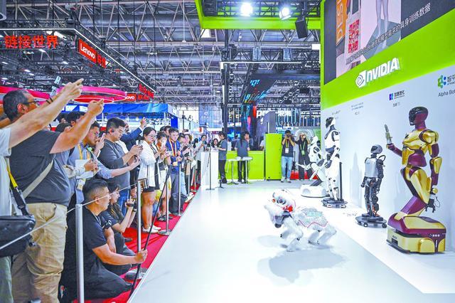 7月16日,在北京举行的第三届中国国际供应链促进博览会上,观众在英伟达展台前观看机器狗表演。(视觉中国)